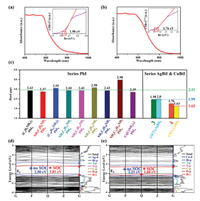 For assessing the suitability for several applications such as photovoltaic applications, the UV–vis absorption and density functional theory (DFT) calculations of 1, 2, 3 and 4 were performed. 1 and 2 show the direct band gaps of 1.99 eV (Figs. S9a and c in Supporting information) and 2.32 eV (Figs. S9b and d in Supporting information), respectively. For 3 and 4, one can see that both abrupt slopes gradually appeared from ~900 nm in UV–vis absorption spectra (Figs. 3a and b) and their optical band gaps can be determined to be 1.98 and 1.76 eV respectively by Tauc plot (inset in Figs. 3a and b). In Fig. 3c, we compared 3 and 4 with the same type of series PbI and two representative double perovskites, namely <100> -oriented perovskites with n = 1. As series PbI, their optical band gaps are all located in the vicinity of 2.51 eV [47-52], the numeric fluctuation is determined by many factors such as the distortion of the PbI6 inorganic framework, ammoniums, and the interlayer spacing. Different from series PbI, due to the influence of Ag or Cu in BI and Bi in BⅢ, the optical band gaps of series AgBiI and CuBiI are around 1.99 and 1.63 eV (the average value of all reported band gaps of the same type of double perovskite, Table S14 in Supporting information) [34, 41], which are significantly lower than that of series PbI, implying that they have a greater possibility of being optoelectronic materials.