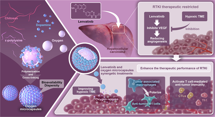 Here, we develop a facile method to prepare nanoparticle-stabilized oxygen microcapsules, which load oxygen in the core of polydopamine nanoparticle shell. The oxygen microcapsules show excellent bioavailability in vitro and in vivo and are stable in water, which serve as good delivery vehicles to relieve the hypoxic microenvironment of HCC. Combined treatments of oxygen microcapsules and Lenvatinib demonstrate a powerful synergetic therapeutic effect by activating anti-tumor immunity. The synergetic therapy using oxygen microcapsules and Lenvatinib could polarize TAMs to anti-tumor M1 cells and activate T cell-mediated tumor cytotoxicity in HCC, which is promising anti-tumor strategy for enhanced therapy of HCC.