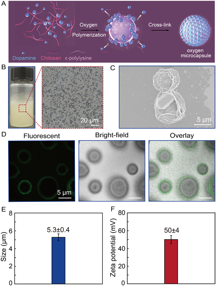| Fig. 2. Characterization of polydopamine-nanoparticle-stabilized oxygen microcapsules. (A) Schematics showing polydopamine-nanoparticle-stabilized oxygen microcapsules. (B) Dispersion of oxygen microcapsules in water. (C) SEM image of collapsed oxygen microcapsules showing ultra-thin shells. (D) Fluorescent, bright-filed, and overlay images of oxygen microcapsules. The shell of polydopamine nanoparticles shows weak fluorescent properties at the periphery of oxygen microcapsules. (E) Size distribution of oxygen microcapsules. (F) Zeta potential of oxygen microcapsules. | |