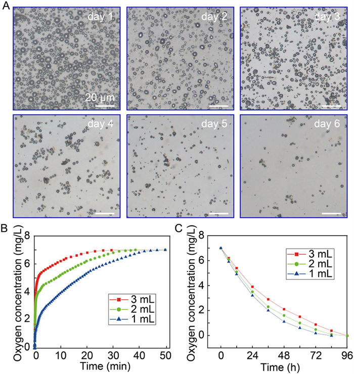 | Fig. 3. Oxygen delivery performances of polydopamine-nanoparticle-stabilized oxygen microcapsules. (A) Optical images of oxygen microcapsules exposed in air over time. The interval between neighboring images is 1 day. As oxygen is gradually released, oxygen microcapsules shrink and collapse. (B) Increase of oxygen concentration over time when 1 mL, 2 mL and 3 mL dispersions of oxygen microcapsules are added into in 10 mL deoxygenated PBS buffer, respectively. PBS is deoxygenated by nitrogen purge. The concentration of oxygen microcapsule dispersions is roughly 1 mL oxygen microcapsules in 1 mL water. (C) Release of oxygen from oxygen microcapsule dispersions over time in a nitrogen environment with nitrogen blowing on the surface. | |