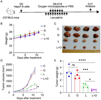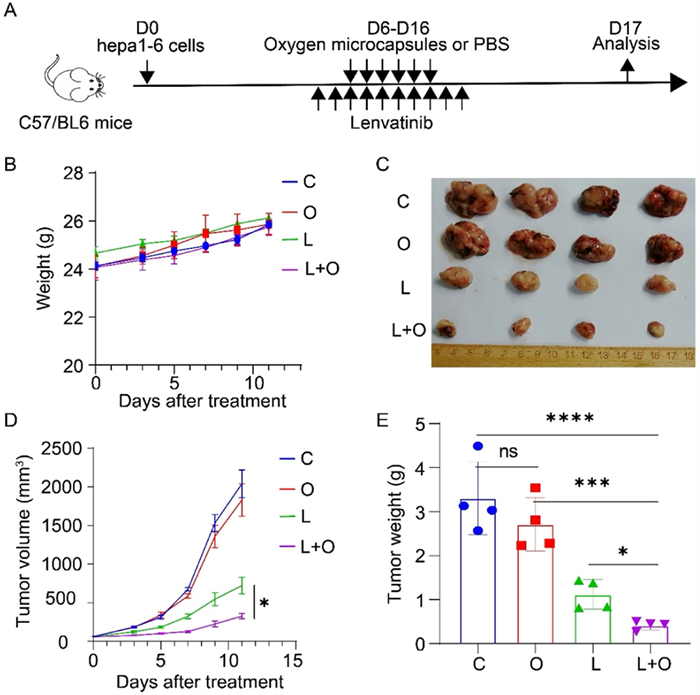 | Fig. 4. Synergetic therapy using oxygen microcapsules and Lenvatinib in vivo. (A) Therapeutic schedule for Hepa1–6 tumor-bearing mice using combined treatments of oxygen microcapsules and Lenvatinib. (B) Body weights of mice under different treatments over time. (C) Photograph of dissected tumors under different therapies. (D) Tumor volumes of mice under different therapies at different times. (E) Changes of tumor weight over time in different groups. Data are shown as mean ± SEM (n = 4 per group). If not specified, C group: Control group; O group: Oxygen microcapsule therapy; L group: Lenvatinib therapy; L + O group: Combination therapy of Lenvatinib and oxygen microcapsules. If not specified, *P < 0.05; **P < 0.01; ***P < 0.001; ****P < 0.0001; ns: no significance. | |
