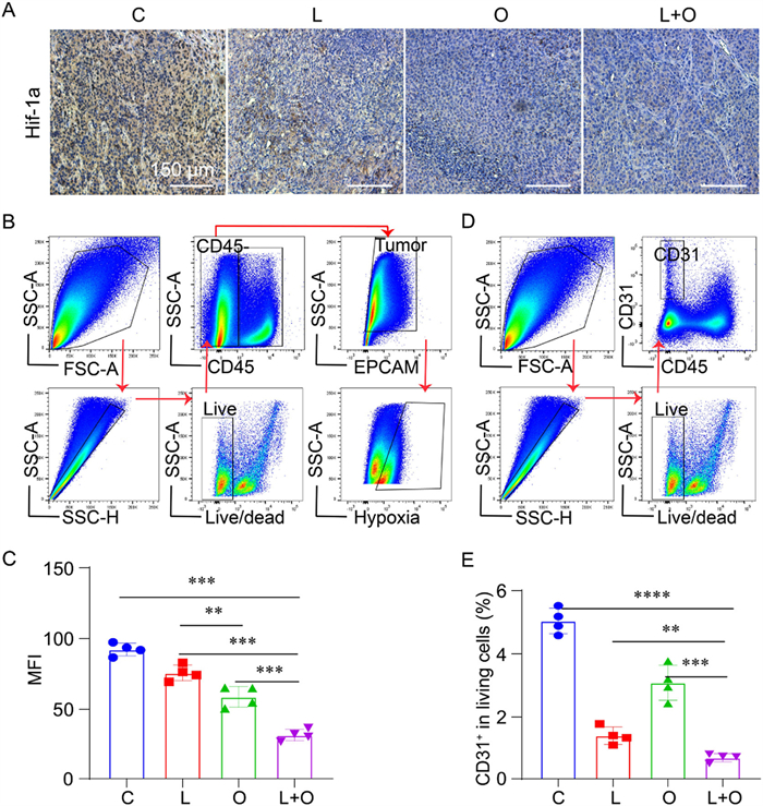 To investigate the underlying mechanism for the enhanced efficacy of the L + O group, the expression of hypoxia-inducible factor-1α (HIF-1α) in the TME is detected by immunohistochemistry, as shown in Fig. 5A. HIF-1α is a major transcription factor involved in the hypoxia response of HCC cells and its expression can reflect the degree of hypoxia in the TME [8,23-25]. Histological examinations of dissected tumors show that the expression of HIF-1α in the O and L + O groups is considerably lower than that in the other two groups, suggesting that intra-tumoral injection of oxygen microcapsules could effectively improve the hypoxia of TME. The improvement of hypoxic condition is further verified by analyzing hypoxic tumor cells (dead dye–CD45–EPCAM+) in the TME using flow cytometry, as shown in Fig. 5B. Hypoxic EPCAM+ tumor cells are significantly reduced in the O and L + O groups, which is consistent with the results of HIF-1α.