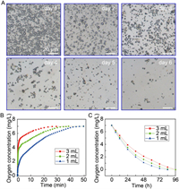 Since oxygen concentration in the oxygen microcapsules is higher than that in air, oxygen will gradually diffuse out of the microcapsules and the microcapsules will eventually collapse over time, as shown in Fig. 3A, which is different from the manner of responsive release. Oxygen microcapsules are preeminent carriers for oxygen delivery. When oxygen microcapsules are added to deoxygenated PBS buffer, oxygen could quickly diffuse into the PBS buffer under the driving force of oxygen concentration gradient, thus quickly increasing the oxygen concentration in the medium, as shown in Fig. 3B. For example, when 1 mL, 2 mL or 3 mL dispersion of oxygen microcapsules is added into 10 mL of deoxygenated PBS buffer, the oxygen concentration reaches a saturated value of 7 mg/L within approximately 37 min, 24 min or 20 min, respectively. To monitor the decrease of oxygen concentration in a nitrogen environment, the above-mentioned oxygen-saturated solutions with different amounts of oxygen microcapsules are placed in a nitrogen environment with nitrogen blowing on the surface. As oxygen diffuses into water and is continuously carried away by the nitrogen flow, the oxygen concentration in the solution will gradually decrease to 0 mg/L at 72 h, 84 h and 96 h for 1 mL, 2 mL and 3 mL dispersion of oxygen microcapsules, respectively, as shown in Fig. 3C. Therefore, the above results suggest that polydopamine-nanoparticle-stabilized oxygen microcapsules are excellent oxygen delivery vehicles.