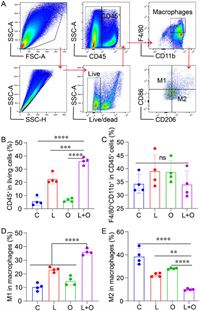 | Fig. 6. Macrophage-mediated immune activation under combined treatments of oxygen microcapsules and Lenvatinib. (A) Gating strategy for macrophages (TAMs), M1 and M2 in the tumor microenvironment by flow cytometry. Proportions of (B) CD45+ lymphocytes, (C) TAMs, (D) M1 and (E) M2 in the TME under different treatments. Data are presented as mean ± SEM (n = 4 per group). **P < 0.01; ***P < 0.001; ****P < 0.0001; ns: no significance. | |
