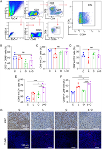 Similarly, T cell-mediated anti-tumor immunity in the TME are analyzed and the gating strategies for Th1 cells and CTLs are schematically shown in Fig. 7A. In general, higher ratios of Th1 cells and CTLs suggest a higher T cell-mediated anti-tumor immunity [33,34]. The results show that there are no significant differences in the ratios of CD3+, CD8+ and CD4+ T cells between different groups, as shown in Figs. 7B-D, respectively. In contrast, the observed ratios of Th1 cells (CD45+CD3+CD4+CD69+) and CTLs (CD45+CD3+CD8+CD69+) in the L + O group are significantly higher than those in the other groups, as shown in Figs. 7E and F. Therefore, combined treatments of oxygen microcapsules and Lenvatinib could induce strong adaptive T cell-mediated anti-tumor immunity.
