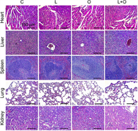 Polydopamine-nanoparticle-stabilized oxygen microcapsules are expected to possess good biocompatibility, since previous studies have suggested that polydopamine, a biocompatible polymer, is a promising carrier for loading different anticancer drugs for cancer treatments [35-37]. To further evaluate the biosafety of oxygen microcapsules, tissues from major organs of mice under different treatments, including heart, liver, spleen, lung and kidney, are examined by histopathological examinations, as shown in Fig. 8. The H & E stained micrographs show no observable tissue damage and no observable difference in the C, L, O and L + O groups. The results are consistent with the previous discussions that there is no significant weight loss in the mice under different treatments. Therefore, combined treatments of oxygen microcapsules and Lenvatinib is a promising therapeutic strategy for enhanced cancer therapy.