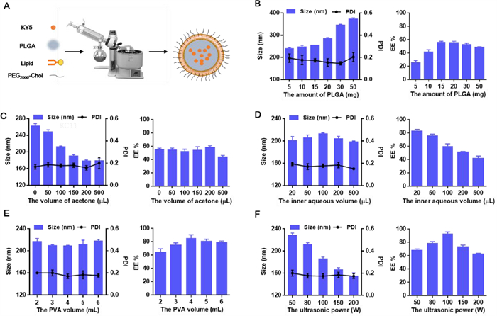 In this study, KY5-CSs were prepared using a modified thin-film hydration-homogeneous dispersion method (Fig. 1A). The optimization of KY5-CSs was performed from the prescription and preparation processes using a single factor analysis. As shown in Fig. 1B, the particle size and encapsulation efficiency of KY5-CSs increased as the PLGA amount increased. When the amount of PLGA was 15 mg, KY5-CSs had a proper encapsulation efficiency and smallest particle size. The acetone in the organic phase helped to control the particle size but had little effect on the encapsulation efficiency (Fig. 1C). As the volume of acetone reached 200 µL, a higher encapsulation efficiency and smaller particle size were obtained. The inner aqueous volume had a great influence on the encapsulation efficiency of KY5-CSs. From Fig. 1D, the encapsulation efficiency decreased with increasing inner aqueous volume; thus, 20 µL of inner aqueous solution was chosen. In addition, as the volume of PVA increased, a slight upward trend of encapsulation efficiency and a fluctuation of particle size were observed (Fig. 1E). As the ultrasound power increased from 50 W to 200 W, the particle size decreased constantly, while the ultrasound power exhibited the best encapsulation efficiency when the power was 100 W (Fig. 1F). In addition, there was no significant change in PDI in all groups. The optimal KY5-CSs were used for the following studies.