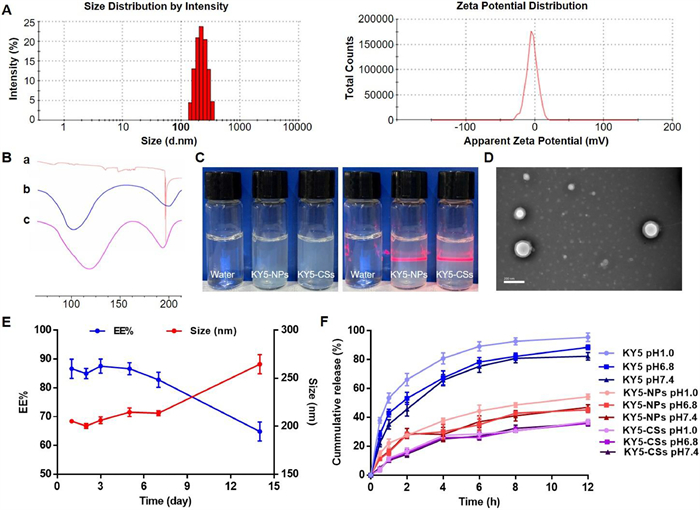 | Fig. 2. Physical-chemical properties of KY5-CSs. (A) Size distribution and zeta potential of KY5-CSs. (B) DSC curves of (a) free KY5, (b) KY5-NPs and (c) KY5-CSs. (C) The appearance under sunlight and the Tyndall effect under laser radiation. (D) TEM images of KY5-CSs. (E) Changes in encapsulation efficiency and particle size of KY5-CSs when stored at 4 ℃ for 14 days. (F) Release profiles of free KY5, KY5-NPs and KY5-CSs in different phosphate buffers (pH 1.2, 6.8, and 7.4). | |