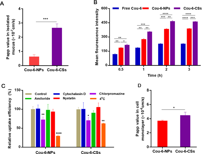 | Fig. 3. (A) Papp values of Cou-6-NPs and Cou-6-CSs across the mucus. (B) The MFIs of Caco-2/HT-29 cells treated with free Cou-6, Cou-6-NPs and Cou-6-CSs for 3 h. (C) Endocytosis mechanisms of Cou-6-NPs and Cou-6-CSs on Caco-2/HT-29 cells. (D) Papp value of Cou-6-NPs and Cou-6-CSs transported across Caco-2/HT-29 monolayers. Data are the mean ± SD (n = 3). *P < 0.05, **P < 0.01, ***P < 0.001 and ****P <0.0001 vs. control. | |