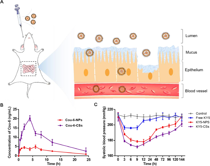| Fig. 4. (A) Schematic illustration of the process of KY5-CSs penetration across mucus and epithelial barriers. (B) Plasma concentration versus time profiles of Cou-6 after oral administration of Cou-6-NPs and Cou-6-CSs at a dosage of 1 mg/kg (n = 4). (C) Changes in SBP after oral administration of free KY5, KY5-NPs and KY5-CSs. Saline was used as a control (n = 6). | |