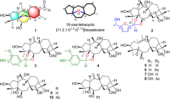 | Fig. 1. Chemical structures of compounds 1−11 and the nomenclature of the unprecedented tetracyclic ring system in 1. | |