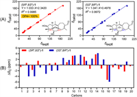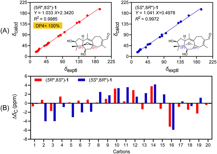 | Fig. 3. Linear correlation plots (A) and relative errors (B) between the experimental and calculated 13C NMR data for (5R*,8S*)- and (5S*,8R*)-1. | |