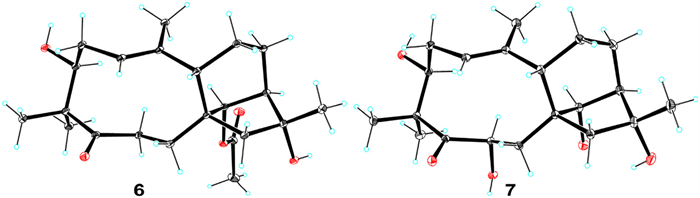 1,5-seco-Grayanane diterpenoids are rare in nature, heretofore, only eight 1,5-seco-grayanane diterpenoids have been reported [4,17]. Dauricanols D (5) and E (6) represent the first examples of 6-deoxy-1,5-seco-grayanane diterpenoid. This is also the first time to report 1,5-seco-grayanane diterpenoids from this plant.