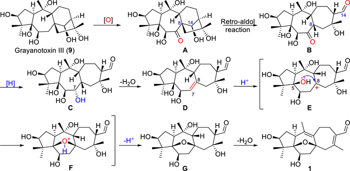 Rhodauricanol A (1) possesses an unprecedented 5/7/7 tricyclic diterpene carbon skeleton, and the name “rhodauricane” was suggested for this new diterpene skeleton, enriching the diterpene skeleton diversity of natural products. The plausible biosynthetic pathway of 1 (Scheme 1) could be tracked back to the co-isolated grayanotoxin Ⅲ (9) [26]. Under the condition of an enzyme-mediated oxidization, 9 is oxidized to a 7-ketone intermediate A. The carbon bond of C-8 and C-14 in A is cleaved by the retro-aldo reaction to produce the key tricyclic intermediate B, which is reduced and then dehydrated to form the ∆7(8) intermediate D. Under the catalysis of acid enzyme, 5-OH attacks the C-8 carbocation in E to yield the 5,8-epoxy intermediate F. Finally, 1 is generated by the dehydration of G.