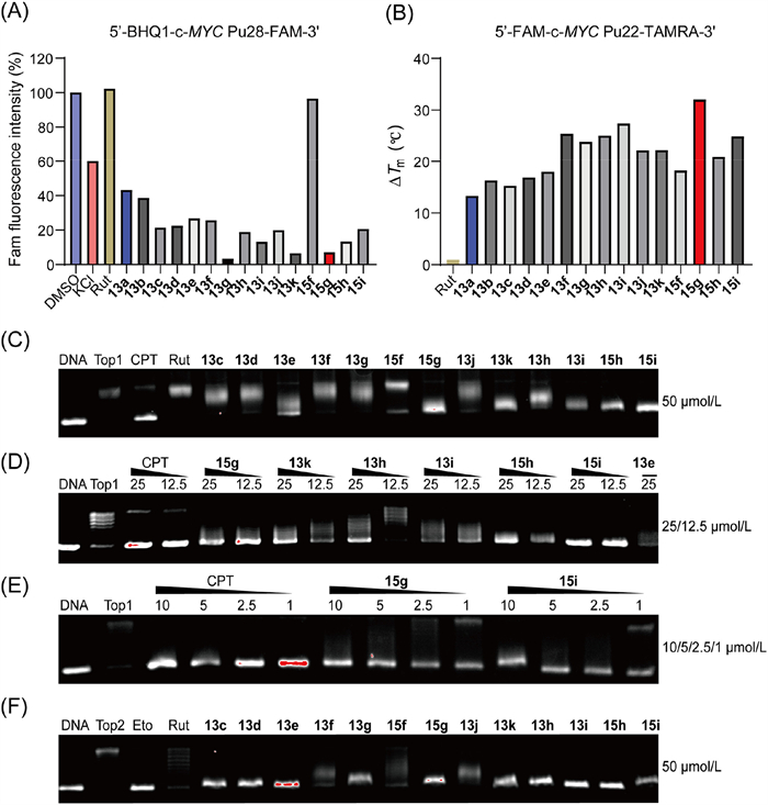 | Fig. 2. c-MYCG4 binding and stabilizing activity and Top1/2 inhibitory activity of rutaecarpine derivatives. (A) FRET quenching assay of DMSO, 100 mmol/L K+, rutaecarpine and its analogues in the presence of labeled c-MYCG4. KCl (100 mmol/L) was employed as positive control in FRET-quenching assay, which decreased the relative fluorescence intensity by 42%. (B) Thermal stabilization values (ΔTm) of c-MYCG4 in the presence of rutaecarpine and its analogues by FRET melting assays. FRET-melting assay was measured in 10 mmol/L K+ using dual-3′-FAM- and 5′-TAMRA-labeled c-MYC Pu22 DNA. (C) Top1 inhibitory activity at 50 µmol/L. (D) Top1 inhibitory activity of compounds 15g, 13k, 13h, 13i, 15h, 15i and 13e ranging from 25 µmol/L to 12.5 µmol/L. (E) Top1 inhibitory activity of compounds 15g and 15i ranging from 10 µmol/L to 1 µmol/L. (F) Top2 inhibitory activity at 50 µmol/L. | |