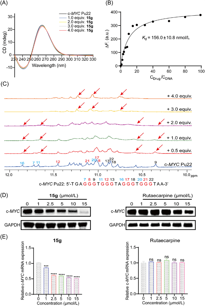 On the basis of the c-MYCG4 and Top inhibitory activities, compound 15g (Fig. 1D) was finally selected for further mechanism studies. Circular dichroism (CD) titration assay revealed that the signature of a parallel c-MYCG4 was maintained (Fig. 3A). Fluorescence-based binding assay indicated that compound 15g showed strong c-MYCG4 binding activity with binding affinity Kd value of 156 nmol/L (Fig. 3B). 1H nuclear magnetic resonance (1H NMR) titration experiments were conducted to examine the binding interactions of compound 15g with c-MYC. Upon the addition of compound 15g, obvious changes of the tetrad-guanine imino proton signals were observed, confirming the binding interactions (Fig. 3C). Western blotting and quantitative reverse transcription-polymerase chain reaction (qRT-PCR) assays were further performed using MCF-7 breast cancer cell line. MCF-7 cells were treated with compound 15g at six concentrations (0, 1, 2.5, 5, 10 and 15 µmol/L) for 24 h. As shown in Figs. 3D and E, compound 15g significantly reduced the levels of c-MYC protein and mRNA at the concentration of 2.5 µmol/L and 1 µmol/L, respectively. In contrast, rutaecarpine itself had no effect on the mRNA level and slightly decreased the c-MYC protein level at a high concentration of 10 µmol/L (Figs. 3D and E). These results further demonstrated the c-MYCG4 binding and stabilizing activity and c-MYC downregulation effect of compound 15g.