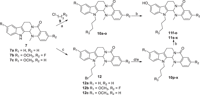 The synthetic route of evodiamine derivatives were depicted in Scheme 1 and Table S1 (Supporting information). In the presence of sodium hydride (NaH), target compounds 10a-o were obtained by nucleophilic substitution reaction via treating compounds 7 [27] with various commercially available 3-chloro propyl amines (9). Target compounds 11f-o were obtained by demethylation of 10f-o in the presence of BBr3 at −78 ℃. Similarly, intermediate 12 was prepared from compounds 7 with 1,3-dibromopropane reaction in the presence of potassium hydroxide (KOH). Then, 12 was treated various commercially available 3-chloro propyl amines (9) to afford target compounds 10p-x. Compounds 11s-x were obtained by demethylation of 10s-x in the presence of BBr3 at −78 ℃.