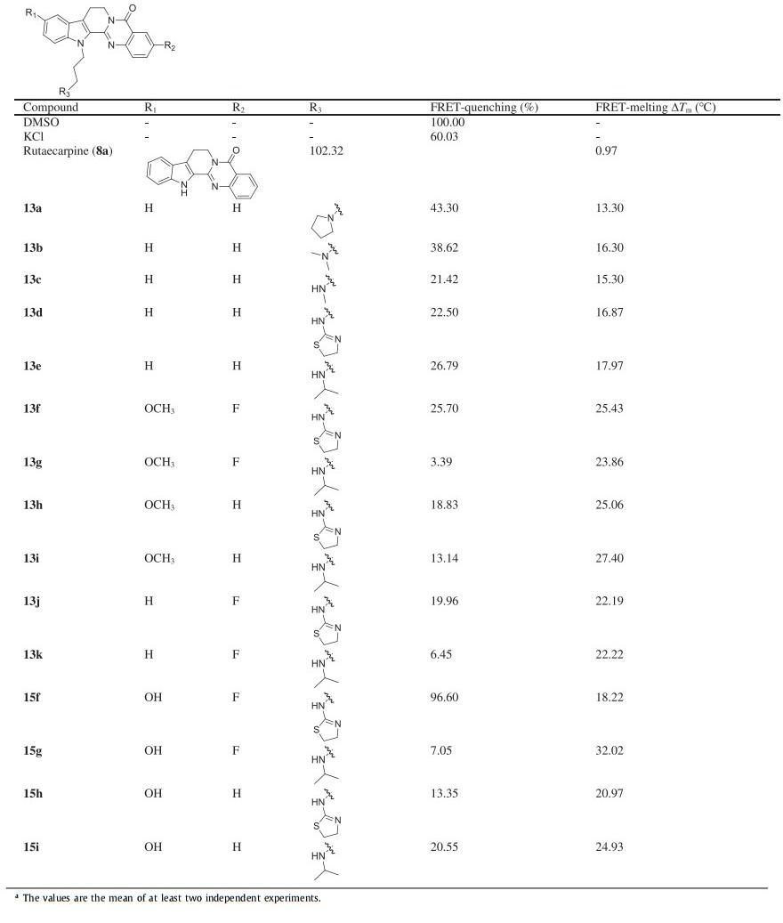 Table 1 The c-MYCG4 binding and stabilizing activities of N13-alkyl amine substituted rutaecarpine by fluorescence FRET quenching and FRET melting assays.a |