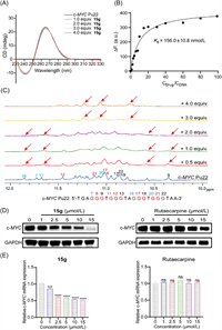 | Fig. 3. c-MYC inhibitory activities of compound 15g. (A) The signature of c-MYCG4 in the presence of compound 15g by the CD titration assay. (B) Binding affinity of compound 15g with c-MYCG4 using fluorescence-based binding assay. (C) Imino proton regions of the 1D 1H NMR spectra of c-MYC Pu22 either alone or with compound 15g. (D) Effects of compound 15g and rutaecarpine on the transcription of c-MYC oncogene in MCF-7 cells by Western blotting. (E) Effects of compound 15g and rutaecarpine on the c-MYC expression in MCF-7 cells by RT-PCR. ns = not significant, ***P < 0.001, ****P < 0.0001 vs. control group, determined with Student's t-test. At least two independent experiments were done for each condition. | |