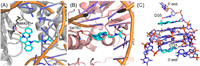 | Fig. 4. The binding modes of compound 15g. Proposed molecular interaction models of compound 15g with Top1 (A), Top2 (B) and c-MYCG4 (C). | |