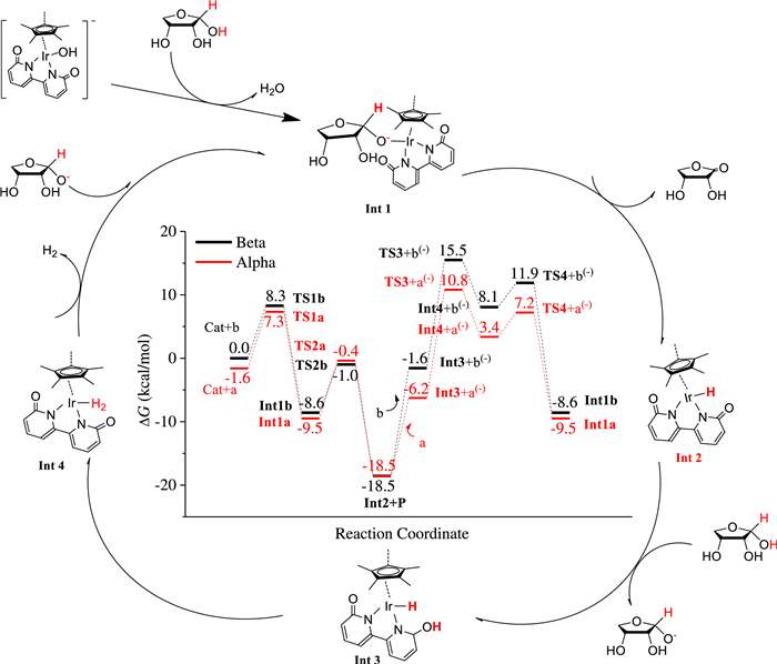 DFT calculations were performed to study the reaction mechanism of ERO to ERL catalysed by [Cp*Ir(bpyO)]OH−. The reaction pathway and its Gibbs free-energy profile at 298.15 K are presented in Scheme 1. In the Gibbs free-energy profile scheme, the red lines are for α-ERO and the black ones are for β-ERO, and names for the species ending with letter "a/b" are for α-/β-ERO, correspondingly. In the first step, the hydroxyl ion of [Cp*Ir(bpyO)]OH− abstracts one proton from α-/β-ERO leaving as water and the resulting ERO ion binds with Ir to form Int1a/Int1b in one elementary reaction step. Subsequently, Ir of Int1a/Int1b abstracts another proton from ERO ion to generate ERL (P) and Int2. Then, Int2 further abstracts one proton from another α-/β-ERO molecule using the oxygen atom of its C=O group, producing Int3 and ERO ion a(-)/b(-). The two hydrogen atoms on Int3, one bonding with Ir and the other bonding with O of C=O, form chemically adsorbed H2 on Ir, i.e. Int4. In the next step, H2 leaves from Ir and then ERO ion a(-)/b(-) binds immediately to Ir to form Int1a/Int1b and completes the catalytic cycle. From Scheme 1, it can be concluded that [Cp*Ir(bpyO)]OH− is just a pre-catalyst. The real catalyst is Int2 because it is the most stable intermediate in the reaction pathway and its generation is fast because the free-energy barriers of the reaction steps leading to it are all below 10 kcal/mol. The rate of the whole catalytic reaction is determined by two consecutive steps. The first step is from Int2 + ERL to Int3 + a(-)/b(-) and the second step is from Int3 to Int4. The overall free-energy barrier of this catalytic reaction is the free-energy difference between the highest transition state (TS3 + a(-)/b(-)) and the lowest intermediate (Int2 + P) in the catalytic cycle, which is 29.3/34.0 kcal/mol for the α-/β-ERO, respectively. The lower free- energy barrier for α-ERO is a result of a(-) being more stable than b(-), which leads to a lower free-energy change from Int2 + ERL to Int3 + a(-). The reason that a(-) is more stable than b(-) is that the oxyl ion in a(-) is stabilized by two adjacent OH groups through intra-hydrogen bonds while in b(-1) there are no OH groups to stabilize the oxyl ion because the OH groups and the oxyl ion are at the opposite side of the ring.