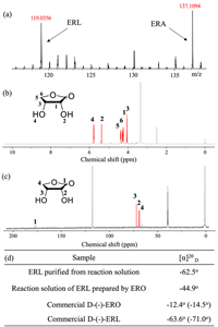 | Fig. 1. (a) Mass spectrometry detection of the purified ERL solution in the positive ionization mode. (b) 1H NMR and (c) 13C NMR spectra of the purified ERL solution (~120 ppm was assigned to the resonance signal of CN in CH3CN), and DMSO-d6 was used as the field-locking reagent. (d) Specific rotations of the purified ERL, reaction solution and commercial d-(-)-ERO and d-(-)-ERL in CH3CN. The concentration of all the aqueous solutions was fixed at 1.0 wt%. The data in parentheses represent their theoretical values in water. | |