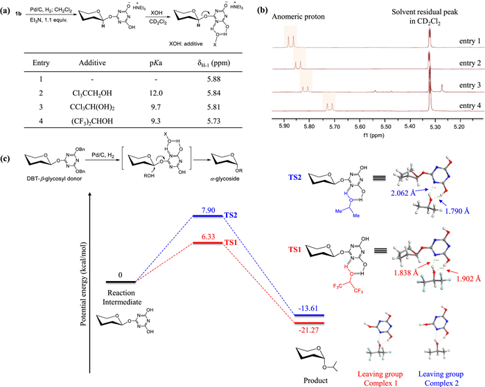 Finally, the reaction mechanism was studied via the NMR experiment and DFT calculation, providing the evidence that hydrogen-bonding interaction between additives and DHT-intermediates is critical for the efficient glycosylation. Normally, it is difficult to monitor the highly reactive intermediate that is very unstable under the ambient conditions. In our experiments, this reaction was able to be inhibited with the addition of amines (e.g., triethylamine), forming the amine-stabilized DHT-glycosyl intermediate, which offers an alternative model to study hydrogen-bonding between additives and intermediates (Fig. 2a). Thus, NMR spectroscopy was performed towards the mixture of amine-stabilized intermediate from 1b and different additives, respectively, to reveal the shifts of the anomeric proton (H-1) signals (Fig. 2b). Since the chemical status of DHT leaving group could influence the electron density of the anomeric center, the chemical shift of anomeric proton might be useful in explaining the observed improvement from additive-assisted glycosylation. Expected shifts (upfield shift of the H-1) could be identified for the mixture of amine-stabilized intermediates and additives in CD2Cl2. Furthermore, the increased upfield shift of the anomeric proton was observed with the decreased pKa values of additives. The magnitude of the chemical shift is thought to be indicative of the H-bond strength. Similarly, another hydrogen-bond-mediated upfield shift of anomeric proton has also been displayed in the thiourea-assisted glycosylation [29].