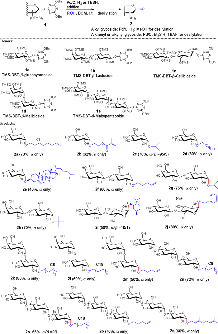 With optimal conditions in hand, we next set out to screen the reaction scope. The glycosylation of diverse acceptors with various donors including oligosaccharide-derived donors were performed smoothly under the standard additive-assisted reaction conditions, affording highly α-specific glycosides in moderate to satisfactory yields (Scheme 1). According to this reaction, series of amphiphilic glycolipids, which are widely used as the nonionic biosurfactants in the cosmetic and pharmaceutical industry, could be prepared in good yields. The obtained alkenyl and alkynyl α-glycosides could be employed as reactive precursor for further reactions such as polymerization for the production of glycopolymers. It was noteworthy that challenging secondary and tertiary alcohols were glycosylated in good α-selectivity under the present method (2e, 2g, 2h). The reaction of higher oligosaccharides (maltopentaose: α(1, 4)-Glc5) also successfully occurred in satisfied yields and with high 1, 2-cis-α-selectivity (2n-2q). These results showed attractive applications of this hydrogen-bond-assisted glycosylation to offer an efficient and simple route towards construction of α-glycosidic bonds.