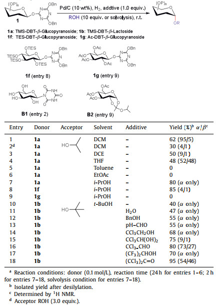 In our previous work (Fig. 1b), a protecting group-free 1, 2-cis-α-glycosylation by using DBT-β-glycosyl donors under hydrogenolytic conditions was demonstrated [27]. The preferential α-selectivity might be rationalized by the speculated H-bond-mediated stereospecific manner (SN2 type). However, the α-selectivity was dramatically decreased in the glycosylation with secondary and tertiary alcohols. The weak hydrogen bond interaction between 4, 6-dihydroxy-1, 3, 5-triazin-2-yl (DHT)-β-glycosyl intermediates and alcohols was postulated as the key factor resulting the undesired stereoselectivity. In this context, we want to employ some hydrogen-bonding additives in this hydrogenolytic glycosylation to offer stronger H-bond interaction (Fig. 1c). Obviously improved reaction efficiency and α-selectivity have been noted with assistance of chloral hydrate or hexafluoro-2-propanol (HFIP). We have also disclosed the experimental evidence for the intermolecular hydrogen-bonding effect via proton NMR and DFT calculation.