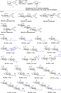 The glycosyl donors were prepared according to our reported work via the direct anomer-activation under aqueous media. Then, the produced DBT-β-glycosyl donors were isolated through simple washing with water and chloroform to remove the native sugars and minor α-type 1, 2-(DBT)2-glycosides (Fig. S2–2 in Supporting information). The protection of trimethylsilyl (TMS) group enables us to synthesize glycosides having hydrophobic moiety, since TMS group acts as solubilizing group in organic solvent like dichloromethane and can be removed under mild conditions like hydrogenolysis. Glycosylation reactions can be carried out under Pd/C (10 wt%)-catalyzed hydrogenolysis conditions, giving rise to the α-glycosides via an SN2-like course. When acceptors containing alkenyl group are used, selective debenzylation and subsequent glycosylation can be achieved by using triethylsilane (TESH) as the mild reductant instead of H2 atmosphere.