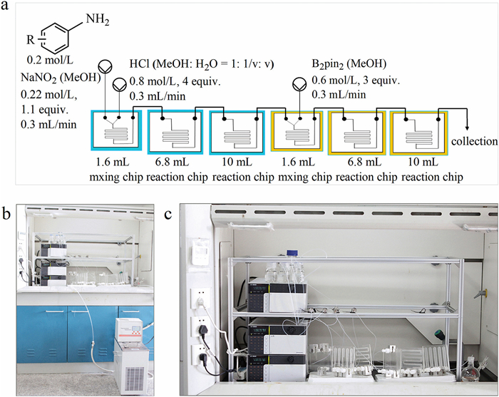 In view of our previous experiments and related reports, the basic MFCs combination and experimental procedure were first implemented, aimed at screening the excellent range of operating conditions and scale-up. The continuous flow device used in this study for the synthesis of aryl borates was shown in Figs. 2b and c. In a previous study [39], methanol was regarded as solvent. To mitigate the precipitation of aryl diazonium salts and NaCl, combined solvent (MeOH: H2O = 1:1, v: v) was applied instead of MeOH for the preparation of aryl diazonium salts.