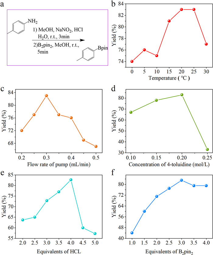 The temperature for preparation of aryl diazonium salts in MFCs was then investigated in the range of 0–30 ℃ (Fig. 3b). Yields of the reaction performed under 20–25 ℃ showed no difference for short residence time. A further increase in temperature to 30 ℃ caused the decomposition of the diazonium salt. These results revealed that continuous flow MFCs devices could synthesize aryl diazonium salts safely and controllably at room temperature. With the optimized temperature conditions, the influence of pump flow rate on the reaction was investigated. Based on the mechanism of this reaction, equivalent ratios of all reactants were determined when the solution was prepared. The adjustment of the flow rate of each HPLC pump was consistent. As shown in Fig. 3c, 0.3 mL/min showed the best yield. The flow rate at 0.1–0.2 mL/min might be too slow to mix the reaction fluids while that at 0.4 mL/min might result in the lack of residence time. Once the previous several influencing factors had been optimized, the effect of changing reactant concentration on yield was considered. It was found that concentration of 0.25 mol/L would lead to insoluble solids which would trigger the system alarm (Fig. S6 in Supporting information). By adjusting the proportion of methanol in hydrochloric acid solvent, it could not solve the microchip blockage caused by insufficient solution of inorganic salt. Based on the trend showed in Fig. 3d, the concentration of 4-toluidine was determined to be 0.2 mol/L. In general, diazotization was carried out under highly acidic conditions. In addition to the formation of nitrite, excessive acid was mainly used to stabilize the diazonium salt. Seven experiments were conducted by changing the equivalents of HCl, the yield changes in MFCs were investigated (Fig. 3e). The results showed that an excellent yield was obtained while 4 equiv. of HCl were applied. However, if the acid concentration continued to increase, the concentration of free amine would decrease, and therefore, slow down the rate of diazotization. Further optimization was focused on the amount of B2pin2. The use of 3 equiv. of B2pin2 would results in best yield. Yet, more or less B2pin2 could not give positive influences.