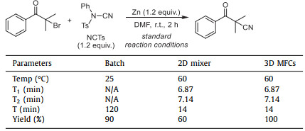 Encouraged by these simulated results, several studies have demonstrated the benefits of this 3D MFCs in an identical reaction. Treating tertiary alkyl halides and electrophilic cyanation reagents with zinc dust provided a practical and safe route to α-cyano carbonyls [25]. A packed-bed reactor was integrated in a liquid-liquid two-phase continuous flow chemical reaction device, which was filled with zinc metal particles. 2-Bromo-2-methylpropiophe (5.0 mmol) was in-situ synthesized into organozinc reagent through the packed bed reactor, and then combined with the electrophilic cyanide reagent N-cyano-N-phenyl-p-toluenesulfonamide (NCTs) (5.0 mmol) in the 3D MFCs to generate α-cyano carbonyl compound (Fig. S5 in Supporting information). Compared with traditional synthesis methods, the optimal reaction parameters in 3D MFCs were as follows: reaction temperature of 60 ℃, residence time of 7.14 min, volume flow rate ratio of 2:1 and the yield was 100% (Table 1). The introduction of solid-phase reagents has greatly expanded the application of the 3D MFCs in the synthesis of complex organic compounds, and the device could be easily modified for reactions involving multi-step synthesis, allowing flexible arrangement and on-demand building block synthesis. In the comparative experiment, we replaced the 3D MFCs with a 2D mixer of the same channel size and liquid storage volume, and the other reaction conditions remained unchanged. In the 2D mixer, the yield was only 60% because it did not have the efficient mass transfer of 3D MFCs and could not be stirred as batch reaction. This experiment not only demonstrated the superior performance of the 3D MFCs, but it also enhanced the design concept of the 3D MFCs by displaying the mass transfer effect and temperature difference that numerous mixers presented.