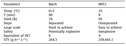 To highlight the advantages of the MFCs, the comparison with the reaction in batch was summarized in Table 3. The use of MFCs chemical processes with high yield required less corrosive reagent consumption. The reaction temperature was changed from ice bath to room temperature and the residence time was cut by 10 times to greatly save energy. It was noted that the method leads to significant simplification of reaction processes and equipment, shorter production cycles, savings in most human costs and improved safety performance. Specifically, the space time yield of MFCs was 982 times higher than batch reaction (Space time yield (STY): STYMFCs = 259, 443.1 g h−1 L−1; STYbatch = 264.3 g h−1 L−1).