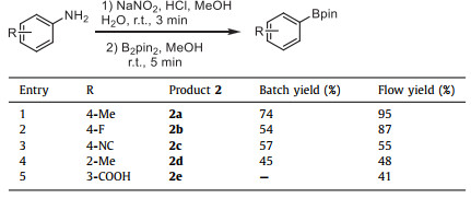 With the optimized reaction condition in hand, the tolerance of different functional groups at the aromatic ring was subsequently explored (Table 4). A variety of substrates were subjected to aryl borate ester formation with good conversion to the corresponding cross coupling products yields of 41%–95%. Especially, synthetic intermediate 2b which could be turned into a treatment for diabetes was successfully obtained with higher yield compared to traditional batch process [40]. Meanwhile, 2e, which could be converted into a drug intermediate for the treatment for idiopathic thrombocytopenic purpura (ITP) [41], was obtained with moderate yield. Some specific substituent groups, such as 2d, the 24 h synthesis yield was only 40% in another experiment [42]. For 1c, this substrate was provided bad conversion to the desired products in previous flow chemistry study and consequently required significant manual handling in order to purify the material [43]. The reaction time was substantially reduced to 8 min and the space time yield was greatly enhanced while ensuring the original yields of 2c and 2d in this work. The study firstly proposed the considerable significance of the range of parameters (MFCs combination, reaction temperature, flow rate, concentration) which could quantitatively influence the yield of diazonium salt in the MFCs, and therefore, determine the subsequent multistep reactions.