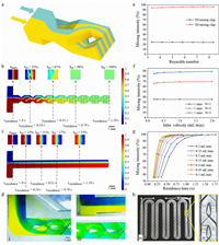 The specific surface area, as a vital factor, of a self-designed microchip of three volumes was calculated compared with that of a half-filled 250 mL round-bottom flask in Table 2. It was clear that MFCs provided at least two orders of magnitude more surface area than round-bottom flasks, which could greatly improve the mass and heat transfer performance of chemical reactions. Two heat-transfer channels were designed sandwich like along two sides of the 3D mixing channel to carry liquid to ensure the reaction temperature (Fig. S2 in Supporting information). Thus, temperature, a key limitation in chemical processes, would be accurately regulated. Two types of 3D MFCs were designed based on the data above, a mixing chip and a reaction chip (Fig. 1h and Fig. S3 in Supporting information). Simulation of the reaction chip showed that the mixing efficiency was still high even with the expansion of channel size (Figs. S1 and S3 in Supporting information). The highly efficient 3D MFCs was well demonstrated, both experimentally and numerically, that could be used in applications ranging from chemical analysis and synthesis of materials to microreaction of fine chemistry.