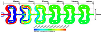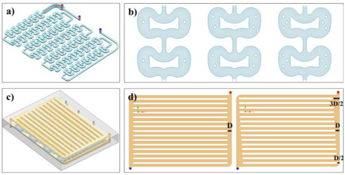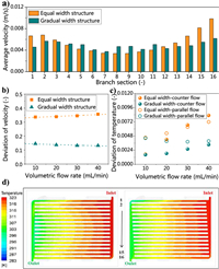 | Fig. 4. Velocity and temperature distribution within heat transfer channels of different structures: (a) Average velocity of each branch at a flow rate of 40 mL/min; (b) Standard deviation of velocity at different flow rates; (c) Standard deviation of temperature at different flow rates (hot fluid flow rate is fixed at 40 mL/min); (d) Schematic diagram of temperature distribution (hot fluid flow rate is 40 mL/min, cold fluid flow rate is 20 mL/min). | |