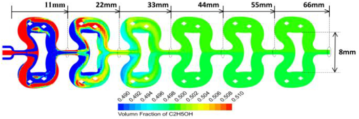The maximum absorption wavelength of the fluorescent substance (tracer) was used for collection of UV spectrogram. As shown in Fig. 6a, a scan was performed in the wavelength range of 180 nm-1100 nm, and the results showed that the maximum absorption wavelength of the tracer was 483.5 nm. The reproducibility of the experiments was evaluated in Fig. 6b, and the relative errors of the absorbance-time curves (run 1–3) of the three parallel experiments were within 5% at a volume flow rate of 30 mL/min. Fig. 6c shows the absorbance response curves at flow rates of 10–40 mL/min. As the flow rate increased, the response time became shorter and the peak height of the response curve became higher. The dimensionless RTD curves are shown in Fig. 6d, with the increase of the flow rate, the convection rate is enhanced and the effect of the axial diffusion rate is weakened, resulting in a narrower RTD density function curve and a shorter trailing length of the curve. The numerical characteristics of the mean residence time, skewness and dimensionless variance of RTD at different flow rates are presented in Table 1. From the dimensionless variance results, an increase of volumetric flow rate intensified the convective flow and makes the breakthrough time of the tracer more concentrated. From the skewness results, the RTD curves are asymmetric left skewed curves at all flow rates, which are mainly caused by two reasons. Firstly, the laminar flow in the reaction channel leads to a radial concentration distribution, so that the tracer at the center of the channel reaches the reactor outlet first while the tracer near the wall is detained, resulting in a long trailing. Secondly, the internal structure of the butterfly-shaped mixing unit causes fluid stagnation in some regions. Although most tracer bypasses these regions and reaches the reactor outlet, some tracer may take longer to reach the outlet once entering these stagnant regions, making a wider RTD curve.