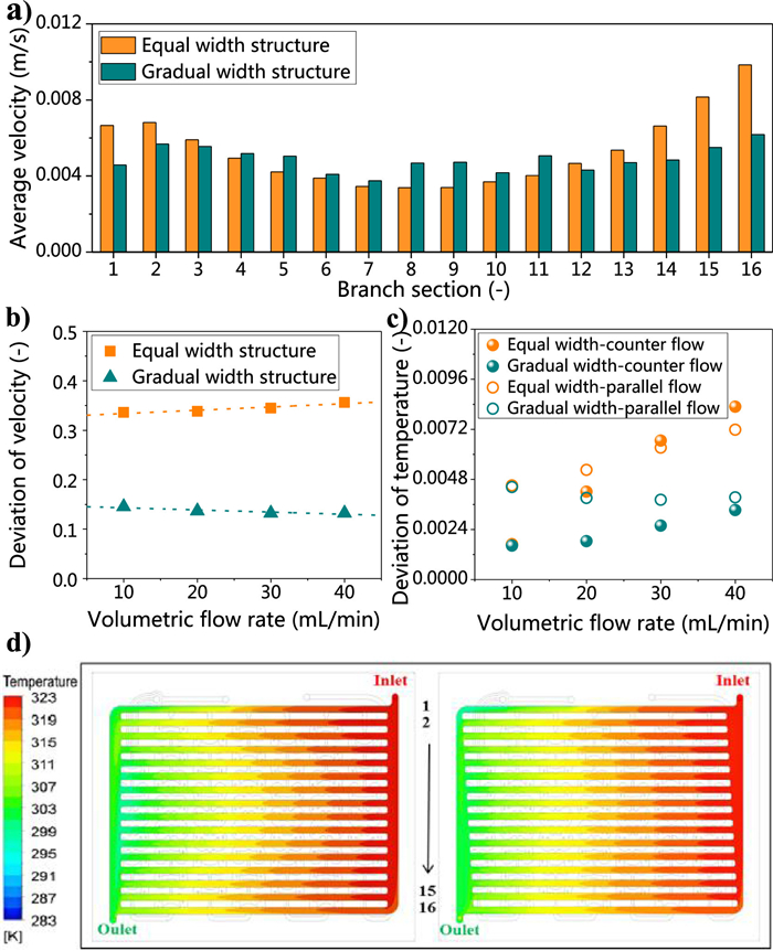 The heat transfer channel used hot and cold water as fluid to simulate the heat transfer process. The flow velocity V of each branch pipe and the standard deviation D of the velocity were used to quantitatively evaluate the uniformity of the fluid distribution under different conditions and structures (calculation equations are shown in Supporting information). The average flow velocity of each branch pipe for the two heat transfer channel structures at the same volumetric flow rate is shown in Fig. 4a, the flow velocity of the equal width structure ranges from 0.0034 m/s to 0.0099 m/s, and the flow velocity of each branch near the inlet and outlet (1–2, 15–16) is larger, while the flow velocity of each branch near the middle area is smaller. In contrast, the uniformity of flow velocity distribution for the heat transfer with gradual width structure is significantly improved, where the flow velocity ranges from 0.0038 m/s to 0.0062 m/s with decreased flow velocity of branches near the inlet and outlet and increased flow velocity of branches near the middle region. The standard deviations of flow velocities for the two heat transfer channel structures are shown in Fig. 4b, at the same flow rate, the velocity standard deviation of heat transfer channel with gradual width structure is much smaller than the one with equal width structure. Fig. 4d shows the temperature distribution within different heat transfer channel in the reaction channel. The comparison shows that the temperature distribution within each branch of the gradual width structure is more uniform than that of the equal width structure. The results of the standard deviations of the temperature distributions within the two heat transfer channel structures at different flow rates and heat transfer modes are shown in Fig. 4c. The results show that the temperature distribution deviation of the gradual width structure is smaller than that of the equal width structure under the same flow rate or heat transfer mode, and the difference between them increases gradually with the increasing flow rate. Thus, the gradual width structure leads to better uniformity in temperature distribution as compared to the equal width structure.