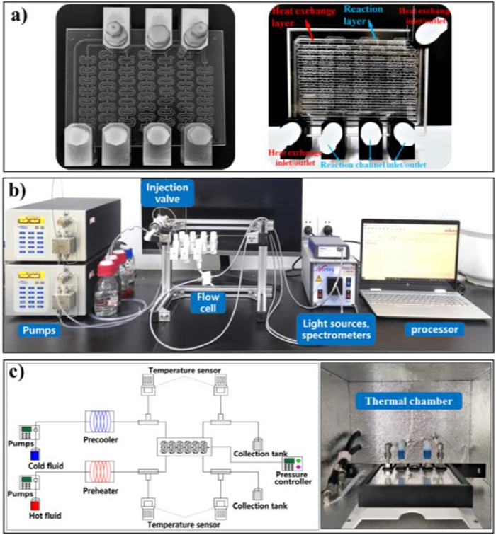 Then, the fabrication of the reactor was performed via femtosecond laser engraving technology, from which two sets of reactors were processed: the one with heat exchange layer and the one without heat exchange layer (Fig. 5a and Table S1 in Supporting information). The experimental setup for the RTD is shown in Fig. 5b), which consists a manual sample injection valve with a 10 µL sample loop (Xinlimei Technology Co., Ltd.), a flow cell (AVENTES Flow-cell-Z-1.5), a light source (AVENTES AvaLight-DHS), a micro-spectrometer (AVENTES AvaSpec-ULS2048XL-EVO) and a processor. The residence time distribution was determined by the stimulus-response method, using deionized water as the flow medium and sodium fluorescein (2.5 g/L) as the tracer. Shortest possible PTFE tubes (0.5 mm ID) were used to connect the reactor to the sample injection valve and the flow cell. The experimental data were the average values from triplicate runs. The scheme for the overall heat transfer coefficient measurement is shown in Fig. 5c. Firstly, the hot and cold fluids were pre-heated and pre-cooled, then fed into the inlets of the reaction channel and the heat exchange channel, respectively, and indirectly heat exchange through the solid wall, and finally flowed out through the outlets of the reaction channel and the heat exchange channel (the experimental setup diagram is shown in Fig. S6 (Supporting information)). A temperature sensor was placed at both the inlet and outlet of the reactor to measure the time-on-stream temperature of the fluid. The reactor and temperature sensor were placed in the thermal chamber, the structure of which is shown in Fig. 5c.