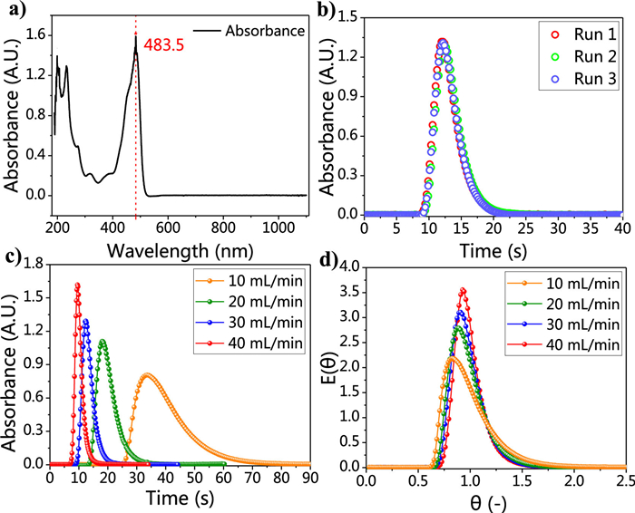 | Fig. 6. Experimental results of RTD in the reactor with 51 mixing units. (a) Full-band spectrum of the tracer; (b) Producibility of the absorbance response curve at a flow rate of 30 mL/min; (c) Absorbance response curves; (d) Dimensionless RTD curve. | |