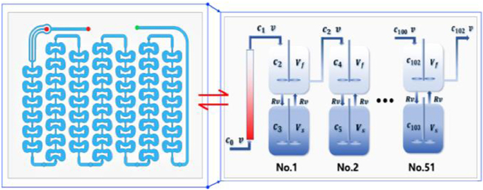 The current study proposed a chained stagnation flow model to describe the RTD of small scale reactors given the effects of laminar flow and stagnation zone on the RTD, and a comparison with common flow models was made. The principle of the model is shown in Fig. 7, where each mixing unit is considered as a combination of two parts: "flow zone (light blue)" and "stagnation zone (dark blue)", and the concentration distribution at its outlet is used as the inlet concentration of the next mixing unit. As a result, 51 such combinations can be used to predict the concentration distribution at the outlet of the last mixing unit. The model adopts two parameters, volume ratio p (ratio of "stagnation zone" to "flow zone") and recycle ratio R (ratio of "fluid exchange rate" to "total flow rate"), to describe the internal flow characteristics for each mixing unit. At the same time, the pipes other than the mixing unit (inlet, outlet and each connecting pipe) are considered as laminar flow and are equated by a portion of inlet pipe to characterize the effect of laminar flow on the whole flow process. The details of the solution of differential equations of this model are shown in the Supporting information.