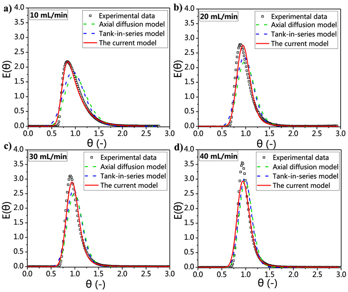 | Fig. 8. Comparison of dimensionless RTD curves from different flow models and experimental data at various flow rates: (a) 10 mL/min; (b) 20 mL/min; (c) 30 mL/min; (d) 40 mL/min. | |