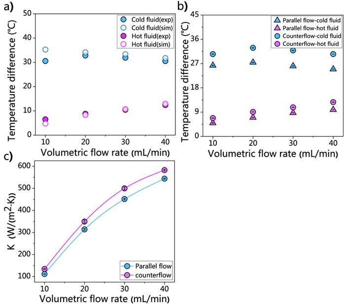| Fig. 9. Results of the heat transfer experiment: (a) Comparison of inlet and outlet temperature difference between simulation and experimental results (counterflow); (b) Temperature difference between hot and cold fluid inlet and outlet; (c) Overall heat transfer coefficient. | |