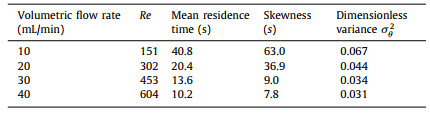 A narrow RTD is important to precisely control the conversion and yield of chemical reactions [23, 24]. However, the predominance of laminar flow in the microchannels usually results in a relatively wide RTD of the tracer material at the outlet [25]. Therefore, many studies have used the RTD as an important criterion for the performance of small scale reactors [26]. The small size of such reactors makes the traditional method via conductivity measurement being ineffective. As a result, new detection methods and devices are required, such as fluorescence microscopy [27] and continuous UV–vis absorption spectroscopy [28]. A further combination of experimental results and flow models can be used to predict the performance of non-ideal flow reactors [29]. Ideal flow models usually consist of plug flow model and complete mixing model. However, in actual reactors, the flow velocity distribution is often not uniform. Also, the presence of reactor internals can cause reverse flow or stagnation zones, resulting in flow deviating from the ideal flow state. Common non-ideal flow models include laminar flow model, axial diffusion model and tank-in-series model. The laminar flow model is suitable for laminar or viscous flows in short channels [30], while the axial diffusion model and the tank-in-series model are suitable for flows close to plug flow or complete mixing flow [31, 32]. However, for the flow in small scale channels, the outlet concentration distribution of the tracer material is often subject to a combination of (laminar) flow and diffusion. So the above models are often biased in terms of skewness and peak value [33], making them difficult to describe the actual flow process.
