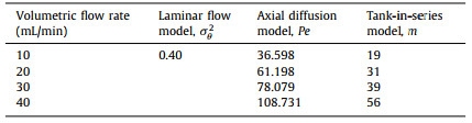 According to the experimental results and the flow model equation, the parameter of each model can be obtained in Table 2. The fitting results of each flow model at different flow rates are shown in Fig. 8. Compared with other flow models, the current flow model is more accurate in describing the laminar flow behavior in small scale reaction channels. Especially at low flow rates, the RTD curves obtained by the current model are very close to the experimental results. In contrast, the curves obtained by the axial diffusion model and the tank-in-series model were highly symmetric under the current flow range, which differs significantly from the experimental results. This is because that the above models are based on the ideal flow state (plug flow or complete mixing flow), while the existence of boundary layer in the actual flow process will make the RTD curve has a certain degree of skew. By introducing two factors, the volume ratio and recycle ratio, the current model can precisely describe the trailing phenomenon caused by fluid stagnation, resulting in a better fitting for the experimental results of asymmetric RTD. In addition, since the current model is based on the number of actual mixing units (m = 51), and the volume ratio and recycle ratios are fixed at the same flow rate, it provides better extrapolation than the conventional tank-in-series model.
