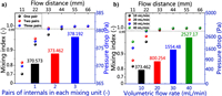 The reaction channel used water and ethanol as fluids to simulate the homogeneous mixing process, and the mixing index M was used to evaluate the degree of mixing [34], the closer the M value is to 1, the more complete the mixing is, and vice versa. Since the mixing process is rapid and the complete mixing can be reached within a short distance, the simulation results were analyzed only for the first six mixing units. As shown in Fig. 2, a cross-section was taken at the outlet of each mixing unit, and enough data points were selected on each cross-section, so the mixing index of each cross-section can be calculated (the calculation equation is shown in Supporting information). As shown in Fig. 3a, the pressure drop increases gradually with the increasing number of internals, while the mixing index for homogeneous mixing increases first and then decreases. This is due to the local turbulence (velocity gradient) is enhanced as the number of internals increases, but at the same time, the mixing time in a single unit is shortened, thereby reducing the degree of mixing at the outlet. Therefore, the mixing process needs to consider the effects of both aspects. In the current study, the structure with two pairs of internals is desired. Further, the mixing index and pressure drop at different flow rates were compared and the results are shown in Fig. 3b, where both the mixing index and pressure drop increased with increasing flow rate. Using M > 99% as the standard for complete mixing, the mixing time in the flow rate range of 10–40 mL/min was about 0.35–2.1 s. The velocity fields and streamlines at different total flow rates are shown in Fig. S5 (Supporting information).