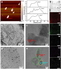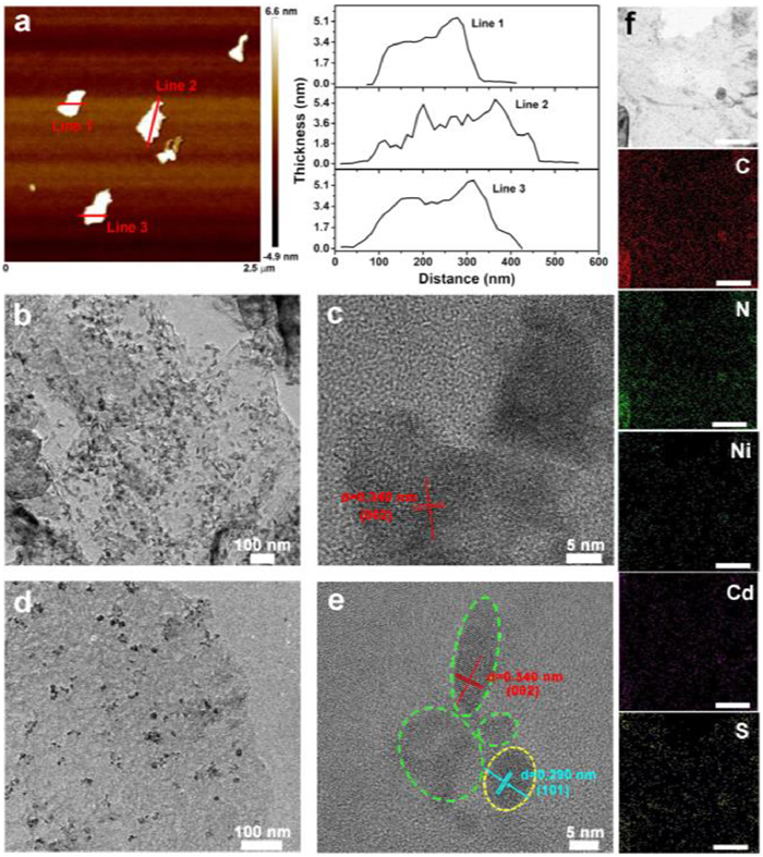 | Fig. 1. (a) AFM image of g-C3N4 and their corresponding height. TEM (b) and HRTEM (c) images of CC-120. TEM (d) and HRTEM (e) images of CCN-25, the green circles refer to CdS and the yellow circle refers to NiS. (f) STEM-EDX images of CCN-25. | |