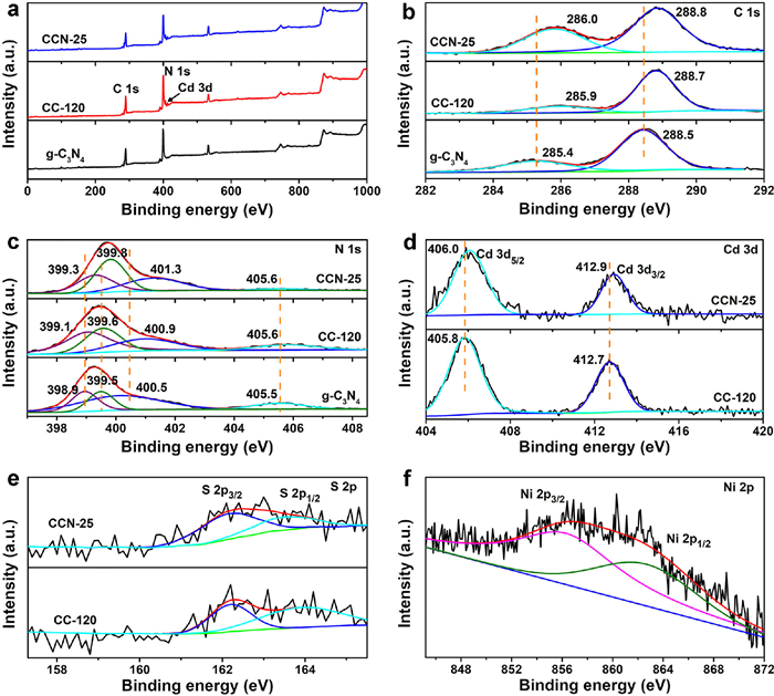 | Fig. 2. XPS spectra of wide-scan (a), C 1s (b), N 1s (c) for g-C3N4, CC-120, and CCN-25. XPS spectra of Cd 3d (d) and S 2p (e) for CC-120 and CCN-25. XPS spectra of Ni 2p (f) for CCN-25. | |