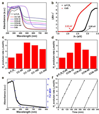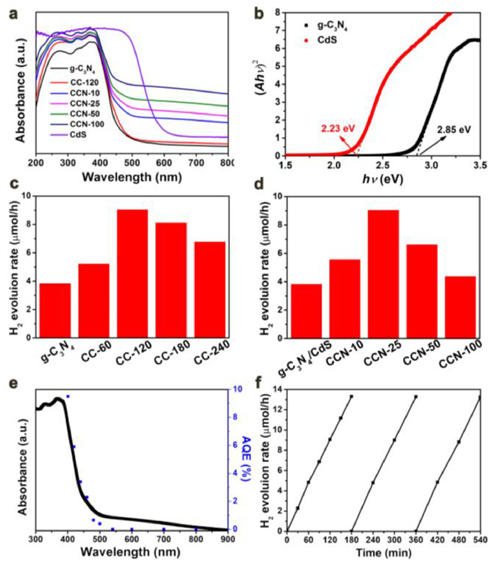 | Fig. 3. (a) UV-vis absorption spectra of g-C3N4, CdS, CC-120, and CCN-Y. (b) Tauc's plots of CdS and g-C3N4. (c) Comparison of photocatalytic H2 evolution activities of g-C3N4 and CC-X under visible light irradiation with a certain amount of NiS as cocatalyst. (d) Comparison of photocatalytic H2 evolution activities of CdS/g-C3N4 and CCN-Y under visible light irradiation. (e) Wavelength dependence of the apparent quantum efficiency for CCN-25. (f) Cycling test of photocatalytic H2 evolution for CCN-25. | |